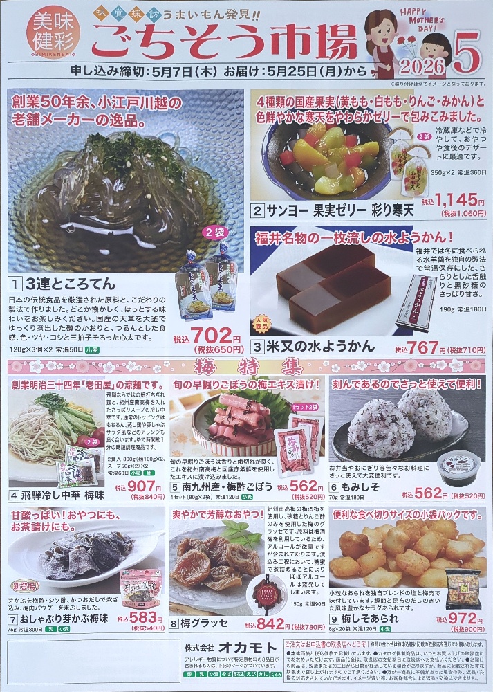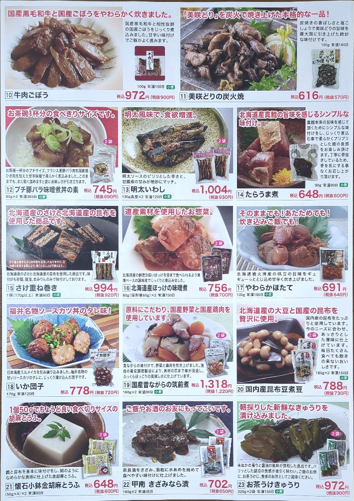 毎月全国の美味しい食材を集めたカタログ「ごちそう市場」を配布し、ルート宅配便にてお届けします。毎月上旬に注文を締め切り、20日前後に配達します。ルート宅配便なので、一つでもご注文はいただけます。毎月上旬に配布し、翌月の初めに注文締切、20日前後にお届けします。